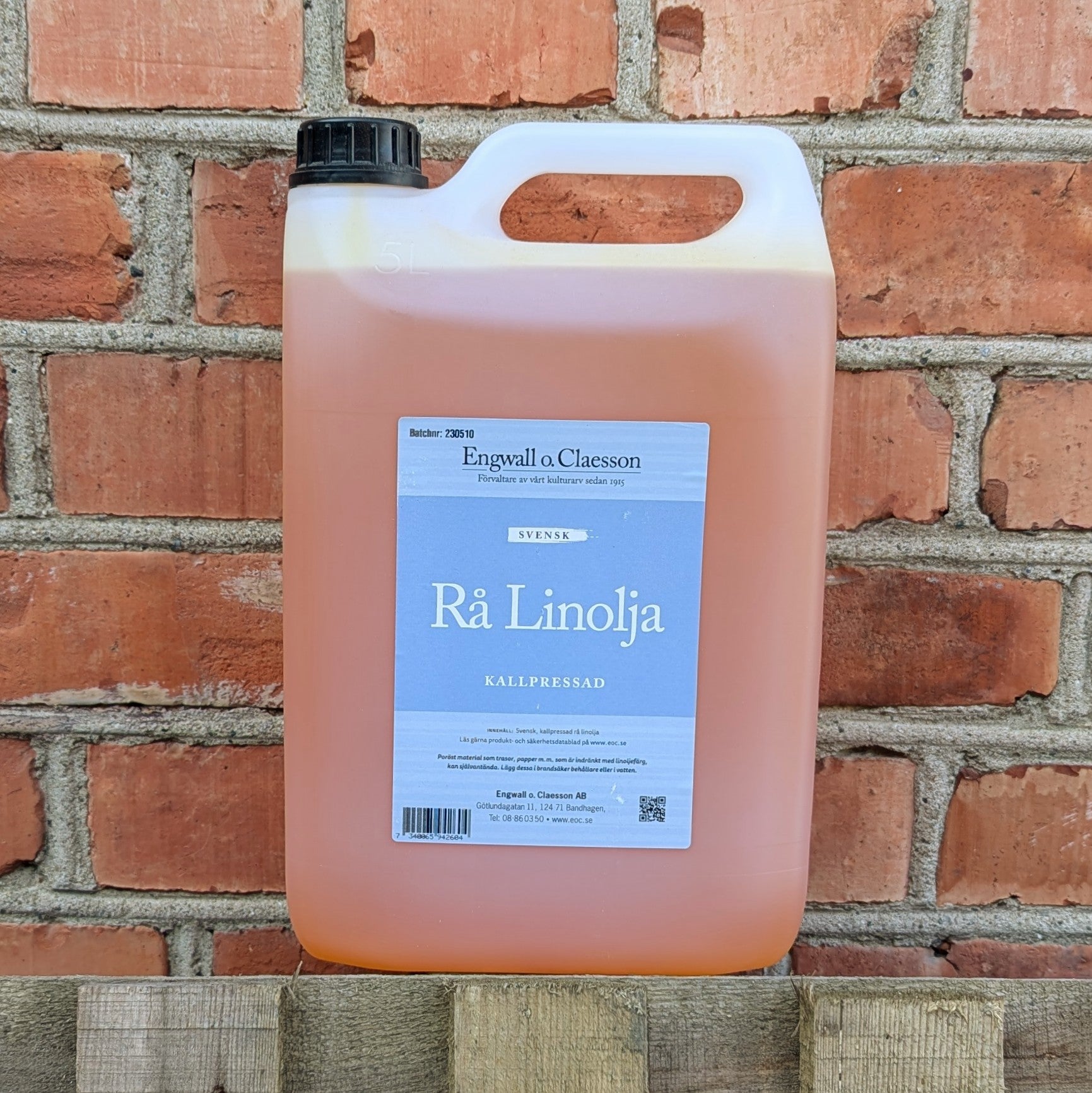 Rå kaldpresset linolje fra Engwall o. Claesson brukes til lasur, behandling, imprengnering av treverk og båter. Meget god inntrengning i treverk. Kan også brukes til ferniss og til tynning av linoljemaling.
