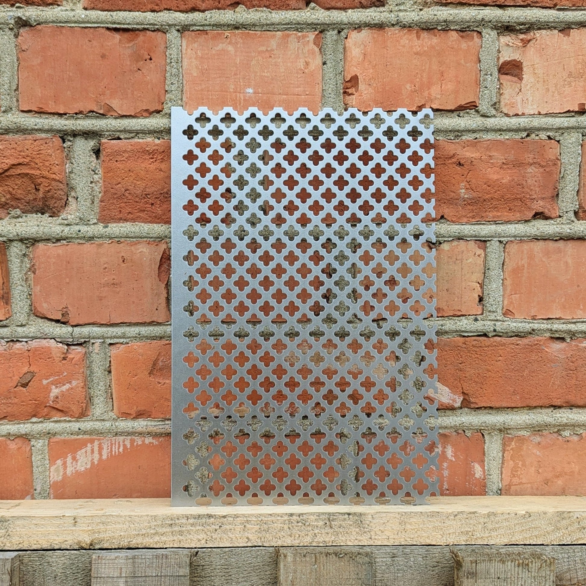 Perforert plåt med tradisjonelt kløvermønster. Kan benyttes til å skjule ventiler ol. Plåten er av ubehanlet står og kan males i ønsket farge.